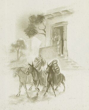 Jesus, Mary and Joseph flee to Egypt from the house of Anne of Bethlehem in Judah. Drawing by Lorenzo Ferri, taken from the book "Valtorta and Ferri".