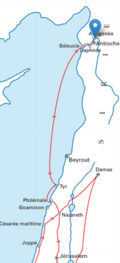 Founded in 307 BCE by the Macedonian king Antigonos Monophthalmos (the one-eyed) on a naturally fortified site. Upon Antigonos’s death in 301 BCE, the city was destroyed by Seleucus and its inhabitants relocated to Antioch and Seleucid Pieria. However, the city continued to be inhabited. It is mentioned by Dion Cassius (40, 29, 1-2) who states that Antigonea was still inhabited in 53 BCE. The coordinates proposed here are based on Maria Valtorta’s indications (“this place near Daphne”[2] [3] between this city and Antioch. This exactly matches what E. Isambert supposed in 1861, who claims to have seen the remains at Zeghaïb[4]. The exact location remains to be discovered, 40 stadia from Antioch (according to Libanius of Antioch Or 11. 85).