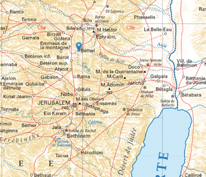 An ancient place of Canaanite worship, Bethel witnessed the passage of Abraham and Jacob. The Ark stayed there around -1100. In -930, Jeroboam installed the main sanctuary of the Northern Kingdom there, which was destroyed in -724. The city is mentioned more than sixty times in the Bible. Yet its exact location is still debated today among archaeologists between Beitin and El Bireh. Several clues in Maria Valtorta's work point rather to Beitin, which corresponds well with tradition (Eusebius and St Jerome) that places Bethel twelve Roman miles north of Jerusalem.[7]