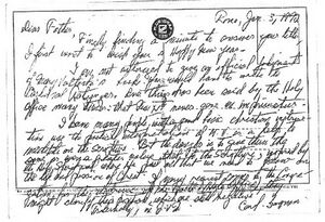 In his response dated January 3, 1992, written in Rome on the back of a postcard, he writes:"I am not authorized to give an official judgment on the books of Maria Valtorta. You should write to Cardinal Ratzinger. One thing has been said several times by the Holy Office: that Pius XII never gave an Imprimatur.I know many people with a good basic Christian formation who use M.V.'s interpretation as an aid for meditation on Scripture. But the danger is to give them the same value, or even a higher value, than Scripture, inspired by the Holy Spirit, where we find all we need to know the life and Passion of Christ.