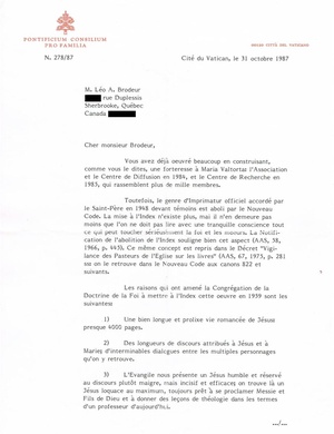 In 1987, Professor Léo A. Brodeur engaged in correspondence with his Canadian compatriot on several points relating to Maria Valtorta for which he was very committed; notably the canonical value of this verbal imprimatur. This issue had gained importance because after the death of Pius XII, the work of Maria Valtorta was placed on the Index. The canonical reason for this condemnation, now abolished, was precisely the lack of imprimatur. At the time of this correspondence, of which we only possess one letter, Cardinal Édouard Gagnon was president of the Pontifical Council for the Family[6] and therefore sat in the Vatican.