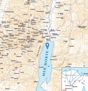 "Sea" located 400m below sea level and into which the Jordan flows; commonly known today as the "Dead Sea"[1].