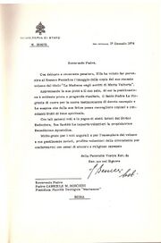 On January 17, 1974, the Secretariat of State, the highest Vatican authority, transmitted thanks from Pope Paul VI:SECRETARIAT OF STATEFrom the Vatican, January 17, 1974