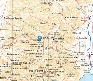 Village located between Beeroth and Ephraim on the border between Samaria, where Jesus condemned by the Sanhedrin took refuge, and Judea. This village is surrounded by caves.It is a hard Good path that Manaen took to lead Jesus to the place where he was expected. A mountain path, narrow, covered with stones, in the scrub and woods. "Here, Master, there is Gophna. Now we turn, I will count three hundred steps and I will be at the caves." Now they are in a rocky and bare corridor, resembling a cavern that rises between the walls of the mountain that almost touch. It looks like a fracture produced by some cataclysm, so strange is it: a huge blow with a large knife in the mass of the mountain that would have cut it off by a good third from the top. Above, up there, beyond the perpendicular walls, beyond the noisy agitation of the trees that grew on the edges of the huge notch, the stars shine, but the moonlight does not descend here, into this abyss.[1]
