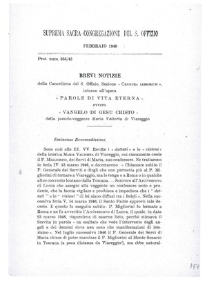 As can be read, the Holy Office opened a file on Maria Valtorta as early as 1945, as indicated by the protocol number (355/45). At that time, the aim was not to evaluate the writings of Maria Valtorta, which were then just beginning to be written, but rather the personality of her confessor, Father Romualdo Migliorini. He was disseminating excerpts of her visions indiscriminately - and against Maria Valtorta’s wishes - and was misguided in his accompaniment of questionable mystics.