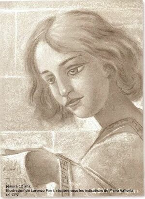 "Jesus is here, in his ordinary white wool garment, a white leaning toward ivory, so different in weight and shade from the brilliant garment that seems made of immaterial linen, so white it seems to be made of threads of light, which covers him in Heaven. He is here with his beautiful long slender hands, ivory white, with his beautiful elongated pale face where his commanding and gentle dark sapphire eyes shine between thick lashes of a sparkling chestnut with reddish blond highlights. He is here with his beautiful long blond and soft hair, reddish blond brighter in the highlighted parts and darker in the shadows."[31]Jesus is rooted in a culture: his Galilean speech is recognizable.[32] He is also very sensitive to nature and creation: