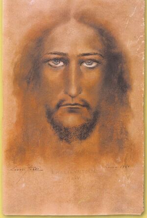 - Dictation of December 29 : "I was able to compare well the two bodies and two faces (of Jesus and Mary), for they were near each other, on the right side of my bed, Jesus near my bedside, Mary to his right towards the foot of the bed. Mary was smaller by a whole head than her Son, so that the Virgin’s head was at the son's shoulder height who is very tall. She is much thinner than him, who has broad shoulders and a sturdy body without being fat. The complexion of the face an ivory white. Only the lips are accented in their color, stark against the colorless skin: the eyes, light blue for the Virgin, darker for the Son, and bigger. Dominating eyes, but so gentle! The hair lighter in the Mother, more vibrant in the Son, but always blonde tending toward copper, also fine, silky with waves ending in curls in Jesus […] Both have an elongated oval face, slim without bony features. Mary’s is more delicate, smaller, proportionate to the body. But the forehead, nose, mouth, shape of cheeks, the eye cut, smooth and rather lowered eyelid, are the same. Except, I repeat, Jesus’ eyes are larger and their gaze is that of a dominator. The hands, very white and tiny in Mary, are more manly in the Son and darker skinned, but their shape is very tapered in both compared to width."[70]