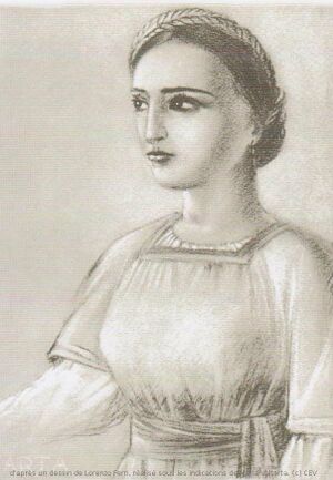 "She is not tall like her sister, but tall nonetheless. She is brunette whereas the other is blonde and fair. Yet she is a beautiful young woman with harmonious features. Hair the color of jet with a slightly dark and even forehead beneath. Her eyes exude gentleness, are black, large, velvety, framed by dark lashes. Her nose is slightly aquiline and her vermilion mouth contrasts with the brown color of her cheeks. She smiles showing beautiful very white teeth. Her woolen garment is dark blue with red and dark green trim at the neck and at the ends of the wide sleeves which stop at the elbow, from which emerge other very fine white linen sleeves tightened at the wrist by a small cord that gathers them. At the top of the chest, also at the base of the neck, appears this very fine white shirt tightened by a cord. Her belt is a fine azure, red and green sash, tightening the upper hips and falling with a fringe knot on the left side. It is a rich and chaste garment."[3]Her qualities as an excellent housekeeper lead to the famous admonition by Jesus[4]: