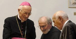 Mgr. Pier Giacomo De Nicolò, Fr. Gabriele Alessandrini, Prior of the Basilica SS. Annunziata di Firenze, and Emilio Pisani, on the day of the celebrations of the Fiftieth Anniversary of the death of Maria Valtorta. Documentary fund of the Maria Valtorta Heritage Foundation.