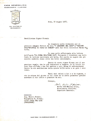 One of her nuns, Sister Maria Uranga, confirmed on July 19, 2001 to the publisher that their foundress had distributed the work of Maria Valtorta in each of the 35 houses she had founded, "because she loved it very much." She had also distributed it to priests and bishops.