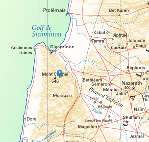 A limestone hill range stretching about 50 km from the bay of Akko to the plain of Megiddo. It is there that Elijah challenged the prophets of Baal and Acherah (1 Kgs 18:20), as Jesus recalls to James: "With the false prophets gathered on Mount Carmel, Elijah approached and said to the people: How long will you hesitate between two sides?"[6].