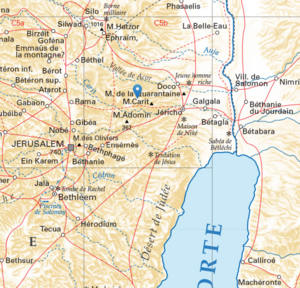 Mount Cherith, described here as a place or as a mountain, would be located west of Jericho, northwest of the Dead Sea, in a remote and wild area, on the border of Judah and Samaria. It is explicitly the place where Elijah was fed by the corbWaterx. Although Essenes are found there, the place described does not resemble the outskirts of Qumran, further south."There are safe gorges there to gather in God, and very close are the roads to Jericho and to Samaria. It is a group of mountains that seems occupied and concerned with continually rising. And each stage, I would say, of its effort is marked by a steep chain of rocky hills, with very steep slopes, cut by narrow valleys like gigantic incisions, crowned with wild ridges. From there, one can incidentally glimpse parts of the Dead Sea located southeast of the place where the Apostles are with the Master. The Jordan and its fertile and peaceful valley are not visible, nor are Jericho or other cities. There are only mountains and more mountains rising towards Samaria, and the dark Dead Sea between two mountainous escarpments. Below, a stream flows east-west that certainly goes to the Jordan."[2]