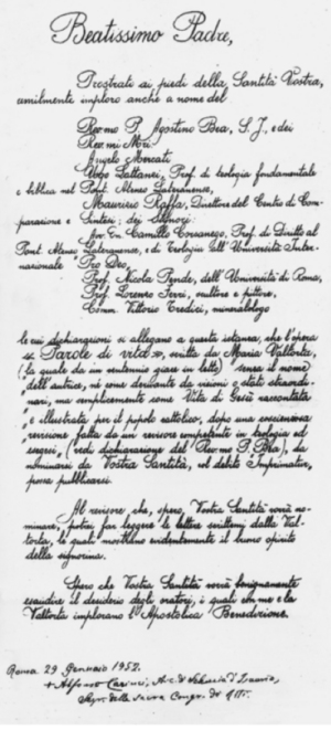 whose declarations are attached to this letter. We request that the Work “Words of Life,” written by Maria Valtorta (who has been bedridden for twenty years), may be published with the Imprimatur, “without author’s name, nor mention of visions or extraordinary states, but simply as the life of Jesus, told and illustrated for the Catholic people, after a meticulous revision carried out by a competent reviewer in theology and exegesis” (cf. the declaration of Rev. P. Bea), to be appointed by Your Holiness.