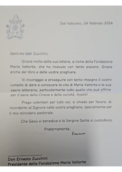 "From the Vatican, February 24, 2024 | Dear Don Zucchini, | Thank you very much for your letter, sent on behalf of the Maria Valtorta Foundation, which I received with great pleasure. Thank you also for the book and for your prayers. | I encourage you to continue with the same commitment your Mission to make known the life of Maria Valtorta and her literary work, especially all that she can offer for the Good of the Church and society. Go forward! | I willingly pray for all of you and I ask you, please, to commend me to the Lord in your prayers, especially for my pastoral ministry. | May Jesus bless you and may the Holy Virgin keep you. | Fraternally, | Francis"