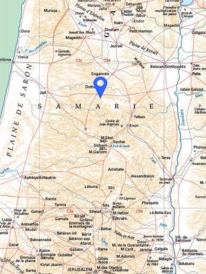 The region of Samaria is bounded to the north by the Jezreel Valley, to the east by the Jordan River, to the west by the Plain of Sharon and Mount Carmel, and to the south by the mountains of Jerusalem.