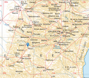 Town 5 km southeast of Azekah near the place where David killed Goliath[1]; it was probably an important administrative center.