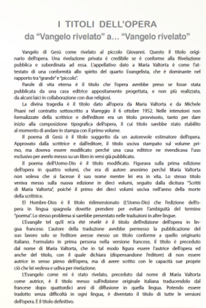 The main work of Maria Valtorta, known today as The Gospel as It Was Revealed to Me, has undergone several title changes throughout its history. It is sometimes difficult to keep track. That is why Emilio Pisani, a witness and early participant, created its historical overview in his Bollettino valtortiano no. 99 (January to June 2020), page 3. The first five titles given to the work were assigned during Maria Valtorta's lifetime and with her consent.